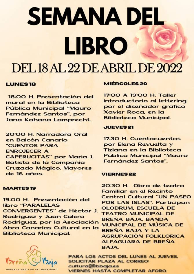 El Ayuntamiento de Breña Baja ha presentado su programa de actividades para la semana del 18 al 22 de abril, con motivo de la celebración del próximo Día del Libro. Con la Biblioteca Municipal Mauro Fernández Santos como epicentro, las actividades se desplegarán por los centros escolares y otros espacios del municipio.