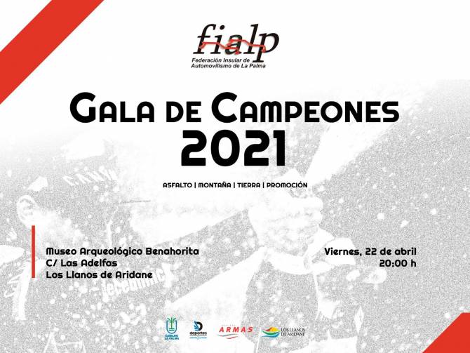 La Federación Insular de Automovilismo de La Palma (FIALP) pondrá punto y final a la temporada 2021 con motivo de la Gala de Campeones que celebrará este viernes 22 de abril en el Museo Arqueológico Benahorita ubicado en Los Llanos de Aridane. Será a partir de las 20:00 h.