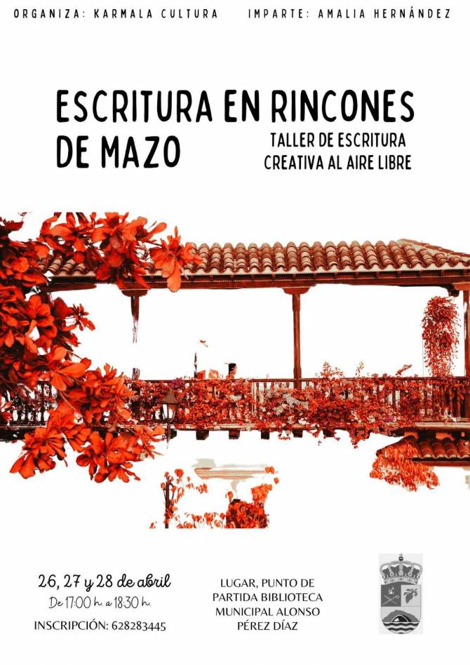El Ayuntamiento de Villa de Mazo, a través de la Concejalía de Cultura y Karmala Cultura, organiza un taller de escritura creativa al aire libre tutorizado por la artista, escritora y dramaturga Amalia Hernández, para conmemorar el Día del Libro 2022. Los encuentros se iniciarán desde la Biblioteca Municipal Alonso Pérez Díaz los días 26, 27 y 28 de abril, en horario de 17:00 a 18:30 horas.