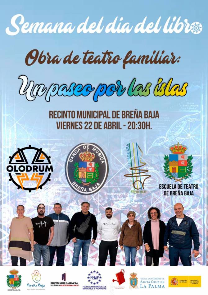 El viernes 22 de abril a las 20.30 hs, en el Recinto Municipal de San José, tendrá lugar el acto de clausura de la "Semana del Libro de Breña Baja" víspera del Día del Libro, con la obra de teatro para toda la familia “Un paseo por las Islas”.