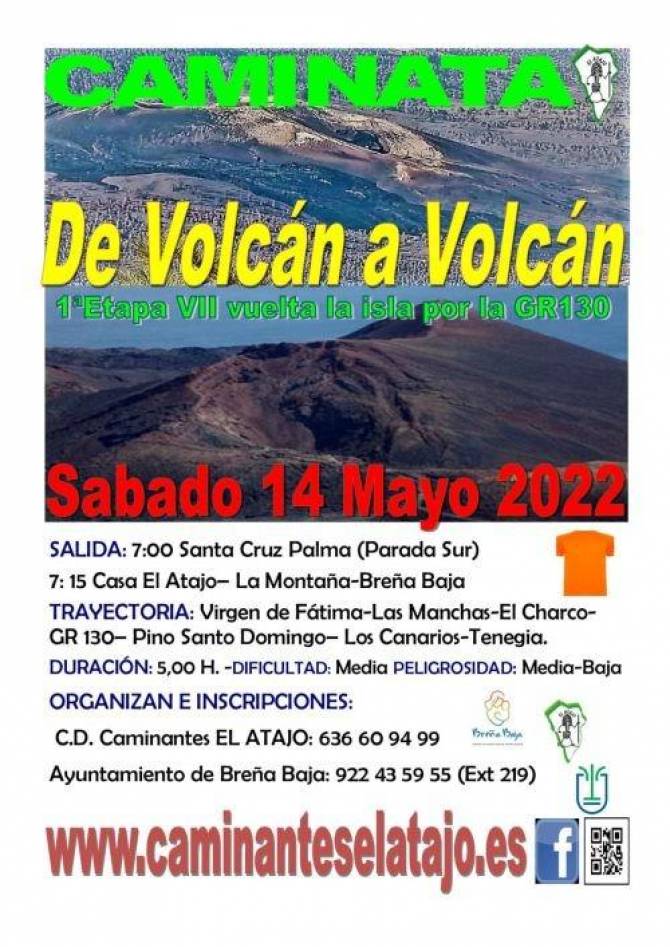 El sábado 14 de mayo, el C. D. de Caminantes "El Atajo" y la Concejalía de Deportes del Ayuntamiento de Breña Baja organizan, dentro del Programa de Senderismo de Breña Baja, la caminata nº 757: "De Volcán a Volcán", desde la cercanía del volcán nuevo al Teneguía.