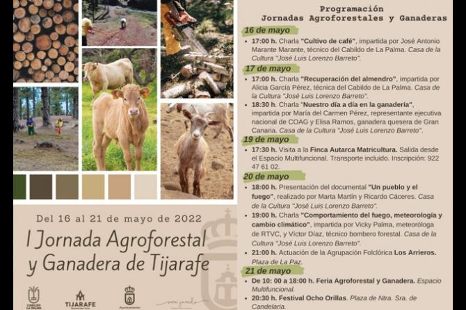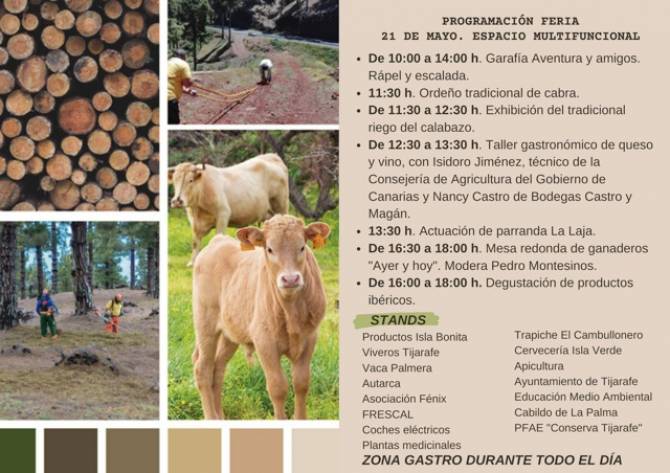 Ya el sábado, 21 de mayo, de 10:00 a 18:00 horas, se celebrará la feria agroforestal y ganadera en el Espacio Multifuncional. Allí se podrán visitar diferentes stands entre los que se encuentran: Productos Isla Bonita, Viveros Tijarafe, Vaca Palmera, Autarca, Asociación Fénix, Asociación EL FRESCAL, muestra de vehículos eléctricos, plantas medicinales, Trapiche El Cambullonero, Cervecería Isla Verde, muestra de apicultura, Ayuntamiento de Tijarafe, Educación Medio Ambiental, Cabildo de La Palma y PFAE “Conserva Tijarafe”.