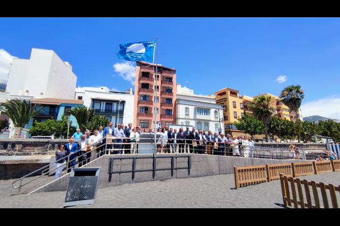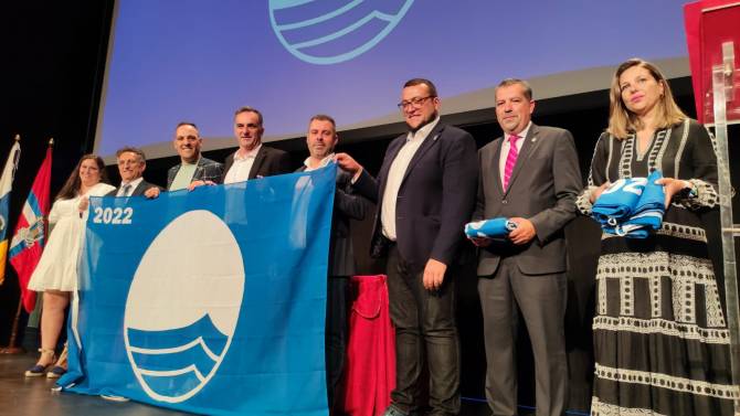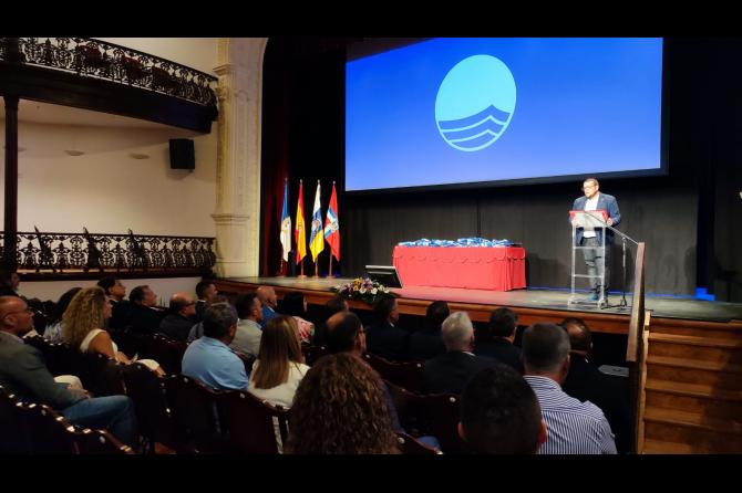 Este galardón se ha izado en la jornada de este sábado, 4 de junio, tras ser recibida previamente en un acto institucional celebrado en el Teatro Circo de Marte donde la Asociación de Educación Ambiental y del Consumidor (Adeac) hizo entrega de las 54 banderas azules a las autoridades y representantes de los 34 municipios y 4 puertos canarios que la han obtenido este año.