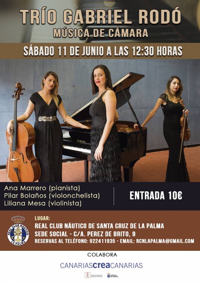 Como parte de la programación cultural organizada por el Real Club Náutico de Santa Cruz de La Palma, se celebrará este sábado 11 de junio a las 12:30 horas, un concierto dirigido al público en general a cargo del grupo “Trío Gabriel Rodó”. Quienes deseen disfrutar de la buena música en directo deberán acudir a la sede social ubicada en la C/A. Pérez de Brito, 9 en Santa Cruz de La Palma.