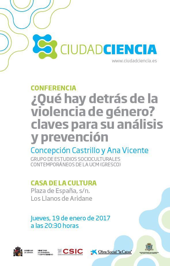 La Casa de la Cultura de Los Llanos de Aridane acogerá este jueves, día 19 de enero, a partir de las 19:00 una jornada gratuita bajo el lema ¿Qué hay detrás de la violencia de género? Claves para su análisis y prevención. La iniciativa, abierta a la participación del público en general, está organizada por el Ayuntamiento de Los Llanos de Aridane y el proyecto de divulgación científica Ciudad Ciencia, dependiente del Consejo Superior de Investigaciones Científicas (CSIC) y la Obra Social “La Caixa”.