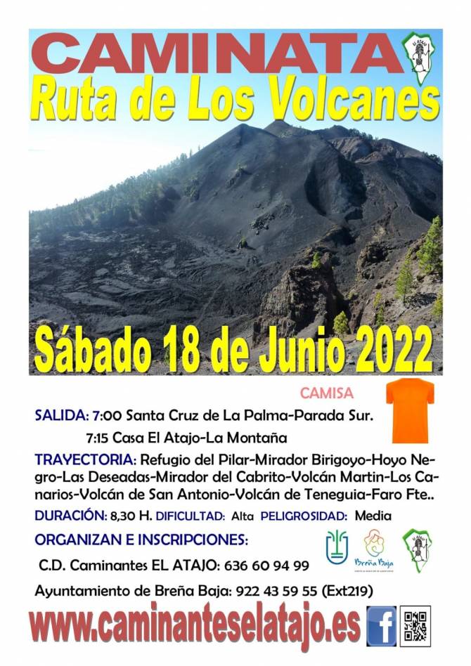 El sábado 18 de junio, el C. D. de Caminantes "El Atajo" y la Concejalía de Deportes del Ayuntamiento de Breña Baja organizan, dentro del Programa de Senderismo de Breña Baja, la caminata nº 762: "Ruta de Los Volcanes".