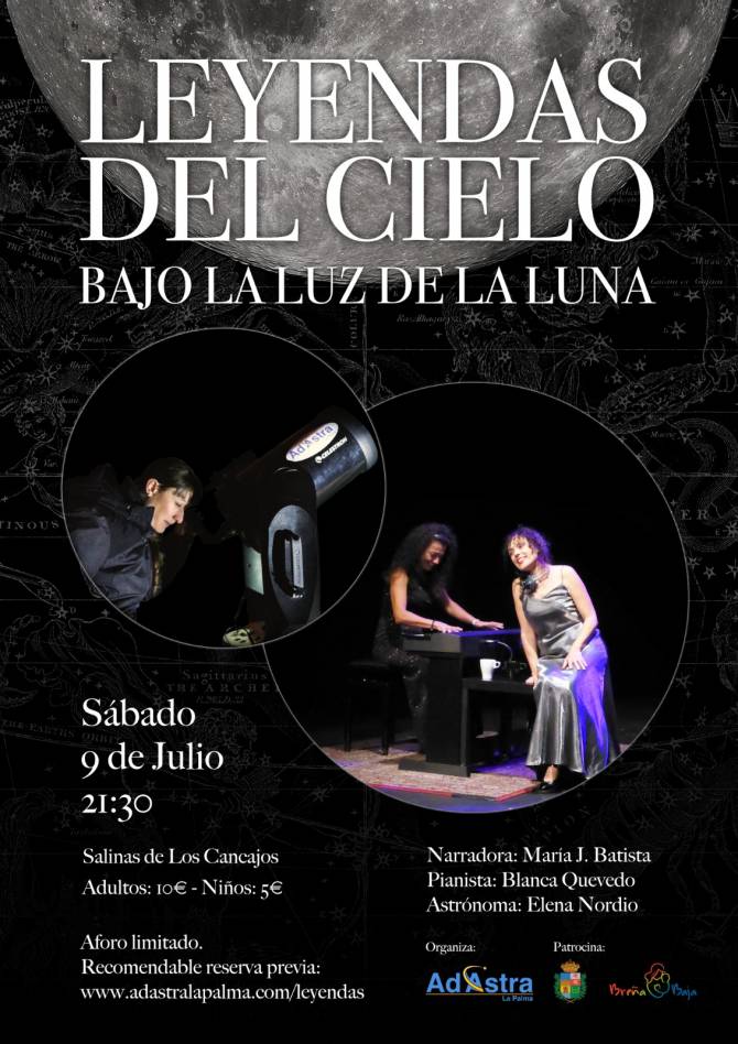 En Leyendas del Cielo bajo la luz de la Luna, la astrónoma Elena Nordio introducirá las constelaciones que dieron origen a los mitos y leyendas del cielo, explicando cómo encontrarlas en la bóveda celeste. La actriz y narradora María J. Batista contará las historias, aportando frescura, intriga y diversión a antiguos mitos y leyendas que se cuentan alrededor del mundo. La pianista Blanca Quevedo aderezará el conjunto, de forma inspiradora y envolvente, con su música.