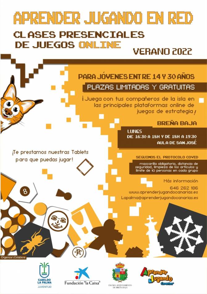 El Ayuntamiento de Breña Baja y Aprender Jugando La Palma han programado durante este verano unas clases gratuitas presenciales de Juegos Online para jóvenes entre 14 y 30 años, en el Aula de Formación de San José (Rambla de los Poetas). Cuenta con la colaboración del Cabildo Insular de La Palma y la Fundación La Caixa.