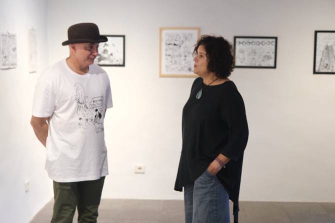 El dibujante Gustavo Mederos García (La Palma,1973) ha presentado en la Casa Salazar de Santa Cruz de La Palma una selección de su obra gráfica, acompañado por la consejera de Cultura y Patrimonio del Cabildo, Jovita Monterrey, que ha valorado la calidad del trabajo del artista palmero.