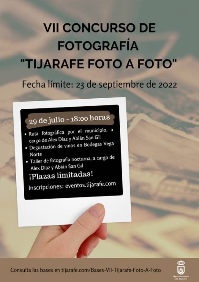 Regresa, por séptimo año, el concurso de fotografía “Tijarafe Foto a Foto” . De carácter internacional, se dirige a todos los aficionados y profesionales de la fotografía y tiene como finalidad promover el municipio, mediante las fotos, para ver todos sus encantos a través de la óptica de los vecinos y visitantes. Se establece un primer premio de 500 euros, un segundo de 300 y un tercero de 150.