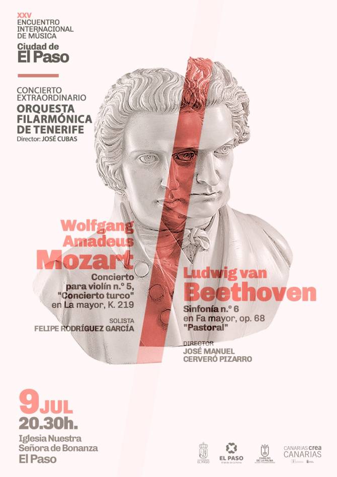 Finalmente, el sábado 9 de julio, en la Iglesia de Ntra. Sra. de Bonanza a las 20:30 horas, el público podrá disfrutar del concierto extraordinario de la Orquesta Filarmónica de Santa Cruz de Tenerife, con músicos de la Banda de El Paso, que interpretarán el Concierto para violín n.º 5 ‘Concierto turco’, en La mayor, K. 219 de Wolfgang Amadeus Mozart y la Sinfonía n.º 6 en Fa mayor, op. 68, ‘Pastoral’ de Ludwig van Beethoven.