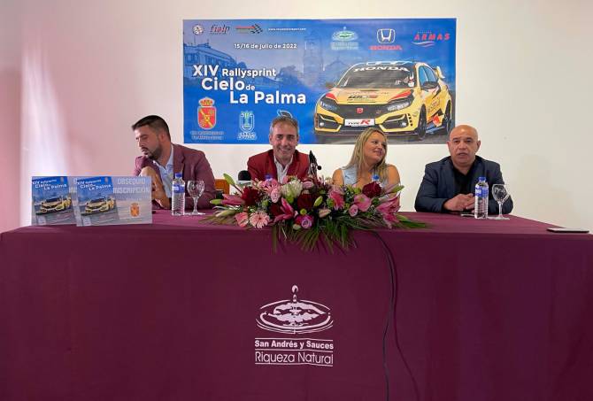 La afición de la isla de La Palma comienza a descontar las horas para vivir la emoción de una nueva competición. Los próximos 15 y 16 de julio se celebrará en San Andrés y Sauces el XIV Rallysprint Cielo de La Palma, que en 2022 es puntuable para el provincial tinerfeño de la especialidad y para el Campeonato Insular de la Isla Bonita. La inscripción, que se cerró el jueves, cuenta con cerca de 50 equipos, mientras que hoy se ha celebrado su presentación en la Casa de la Cultura.