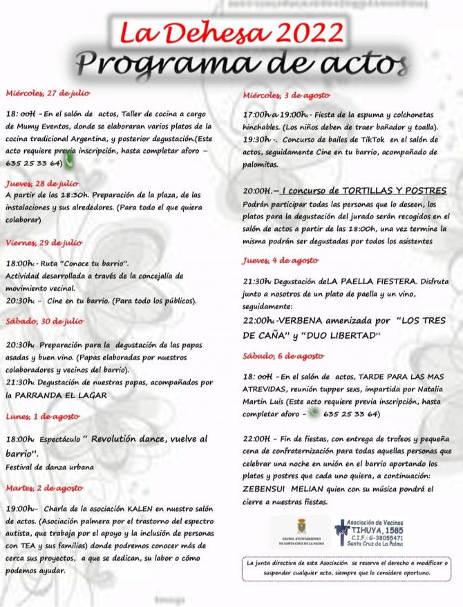La Asociación de Vecinos Tihuya organiza una decena de actividades desde este viernes, 29 de julio hasta el próximo 6 de agosto para toda las edades que incluye degustaciones populares, rutas por el barrio, verbenas, concursos gastronómicos y cine, entre otras