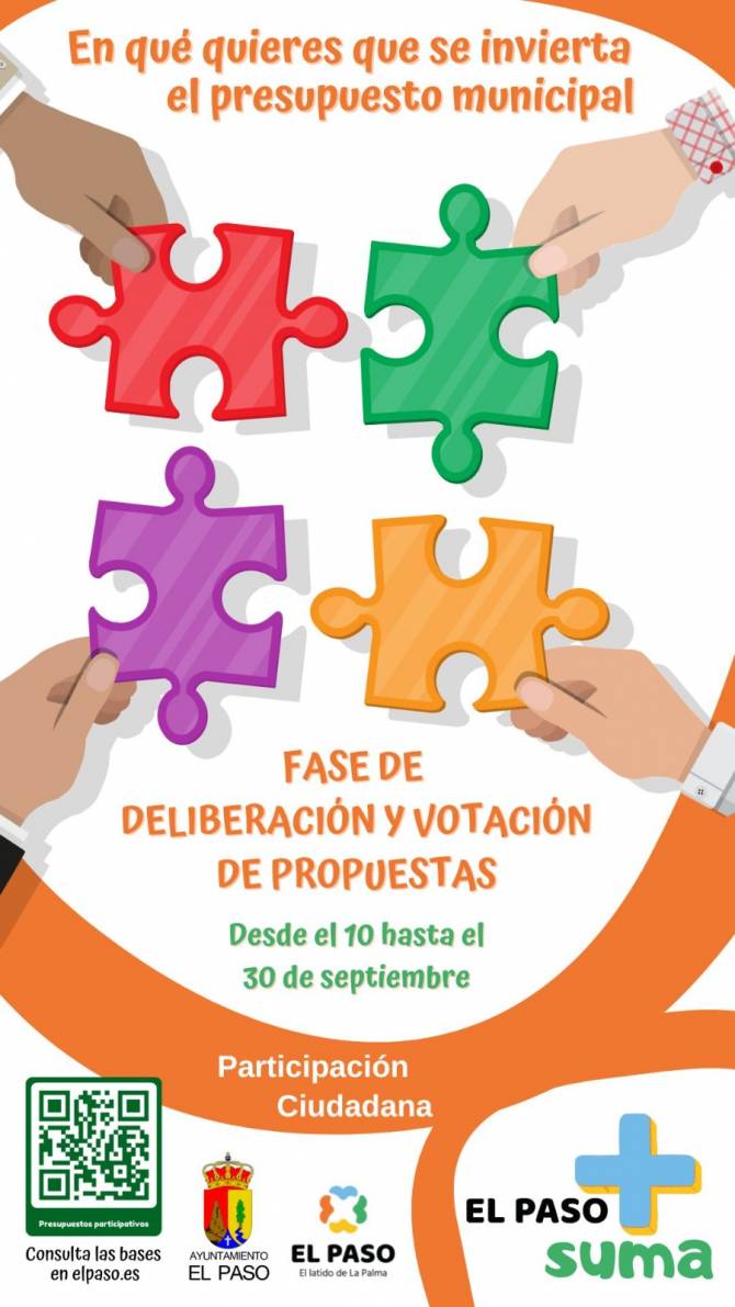 Desde el 10 de septiembre, y hasta el 30 del mismo mes, las personas empadronadas en El Paso, mayores de 16 años, podrán elegir cuales de esas ideas considera que deberían incluirse en los presupuestos municipales del ejercicio de 2023. Para ello, la organización ha preparado un formulario, que podrán encontrar en la página de participación ciudadana de la web municipal (www.elpaso.es) Cada persona podrá votar por hasta 3 propuestas y el resultado final será un listado ordenado de mayor a menor interés, que posteriormente deberá incluir cuantas propuestas tengan cabida hasta agotar los 250.000€ que se han destinado para este año.