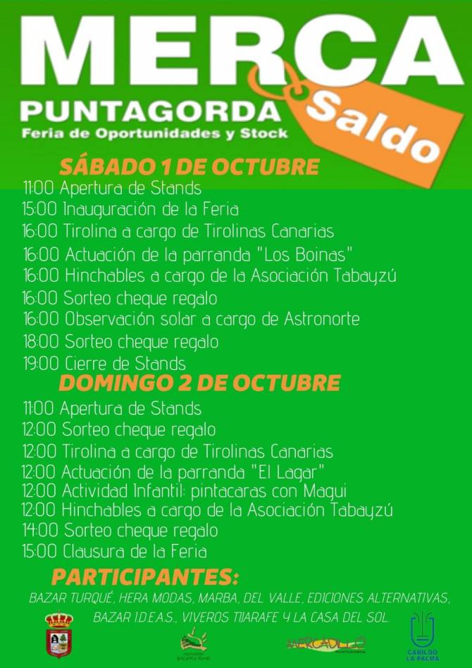 Esta feria de oportunidades impulsada por el Ayuntamiento de Puntagorda con la colaboración del sector comercial del municipio, potenciará las compras con el sorteo de cheques regalo por valor de 60 euros cada uno. La agenda de 'Mercosaldo' continuará el domingo, 2 de octubre, con 'Tirolinas Canarias', la actuación de la parranda 'El Lagar', y la diversión en un espacio lúdico dedicado a los más pequeños con la 'Asociación Tabayzu' y 'Magüi'.