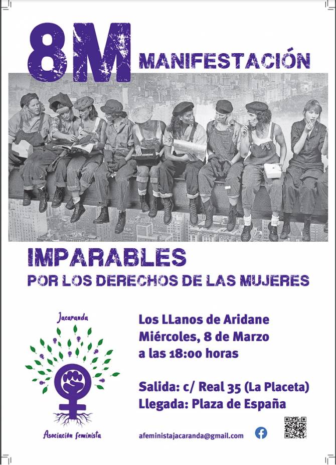La Asociación Feminista Jacaranda Palmera, vuelve a organizar la Manifestación del 8 de Marzo, invita a la participación de las palmeras y palmeros a uno de los días más señalados en el calendario feminista y además apoya la manifestación de Santa Cruz de La Palma que organiza la Plataforma feminista palmera.