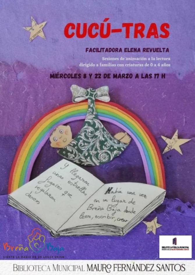 La Concejalía de Cultura del Ayuntamiento de Breña Baja sigue promocionando actividades en la Biblioteca Pública Municipal de Breña Baja "Mauro Fernández Santos" (San Antonio). Para el mes de marzo continua las sesiones de “Cucú-Tras” (0-4 años), para los días miércoles 8 y 22 a las 17 hs y facilitado y dinamizado por Elena Revuelta.