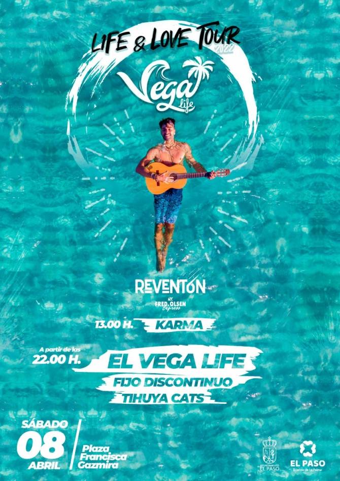 El joven músico nacido en Gáldar (Gran Canaria, 1990) es uno de los artistas canarios más reconocidos en la actualidad y su música, alegre y llena de buenas vibraciones, inundará las calles de El Paso en la noche del sábado 8 de abril a partir de las 22:00 horas. El Vega mezcla sonidos y ritmos canarios con otros como el reggae, el hip-hop o la rumba y se refresca con ritmos latinos y su singular voz.