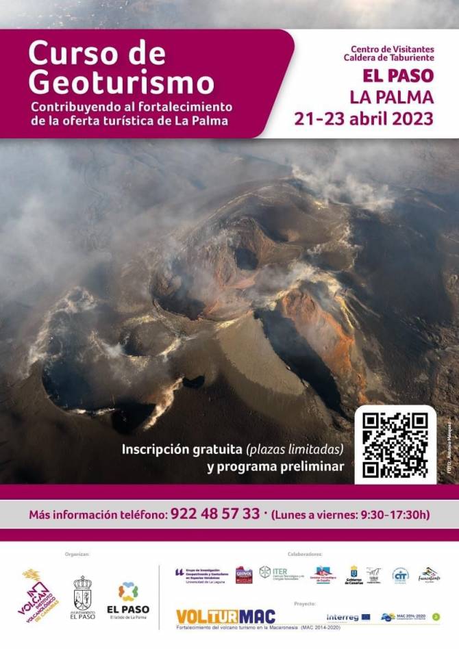 El “Curso de Geoturismo: contribuyendo al fortalecimiento de la oferta turística de La Palma” que organiza el Instituto Volcanológico de Canarias (INVOLCAN) y el Ayuntamiento de El Paso se celebrará en el Centro de Visitantes del Parque Nacional de la Caldera de Taburiente durante los días 21, 22 y 23 de abril de 2023 entre las 09:00 y las 14:00 horas. El programa del curso incluye diversas ponencias relacionadas con los procesos, productos y formas relacionadas con el fenómeno volcánico, el geoturismo en espacios volcánicos, la identificación, selección y valoración de recursos para el geoturismo en territorios volcánicos y el diseño de itinerarios de geoturismo en espacios volcánicos naturales y urbanos. Durante el mismo también se realizarán otras actividades como la proyección del documental “Teide, un gigante dormido”, una visita al caso urbano de El Paso como ejemplo de geoturismo urbano y la salida de campo “Volcanes históricos en El Paso (Tacande -Tajogaite): diversidad patrimonial para itinerarios interpretativos”.