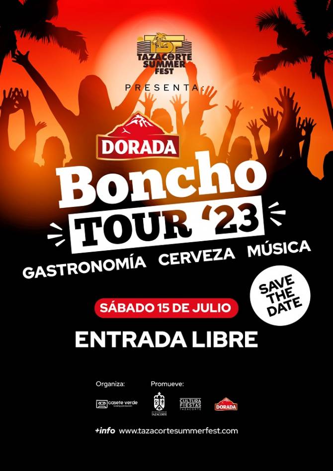 La Villa y Puerto de Tazacorte acogerá el próximo sábado 15 de julio de 2023, dentro de sus Fiestas del Carmen, la primera edición del Tazacorte Summer Fest, evento que llegará de la mano del conocido “Boncho Tour” promovido por la empresa canaria Cerveza DORADA. Se trata de un festival que mezclará gastronomía, música y el buen clima que reina en la localidad bagañeta para crear una experiencia veraniega completa a sus asistentes. Otros “Boncho Tour” promovidos por Cerveza Dorada ya se han realizado con éxito en la vecina isla de Tenerife en lugares como el Puertito de Güimar o el Faro de Bajamar, entre otros, atrayendo a miles de asistentes y visitantes y dinamizando estas áreas costeras de la isla vecina.