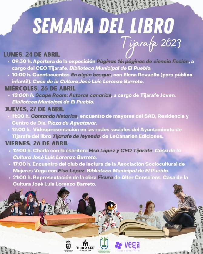 El miércoles, 26 de abril, la Biblioteca Municipal de El Pueblo acogerá el scape room Autoras canarias, a cargo de Tijarafe Joven. Los mayores del municipio también tendrán su espacio en esta semana de actos con el encuentro de usuarios y usuarias del SAD, Residencia y Centro de Dia, Contando historias, en la Plaza de Aguatavar a las 11:00 horas. Mientras que a las 12:00 horas se emitirá a través de las redes sociales del Ayuntamiento de Tijarafe la videopresentación del libro Tijarafe de leyenda de LeCanarien Ediciones.