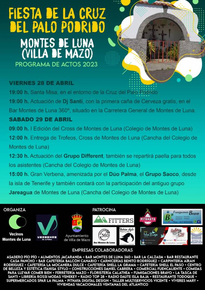 Para esta ocasión, el programa previsto, que se desarrollará entre el 28 y el 29 de abril, arrancará con la celebración con una misa en el entorno de la Cruz, a partir de las 19:00 horas. En la misma jornada se llevará a cabo la actuación del Dj Palmero Santy, en el Bar de Montes de Luna.
