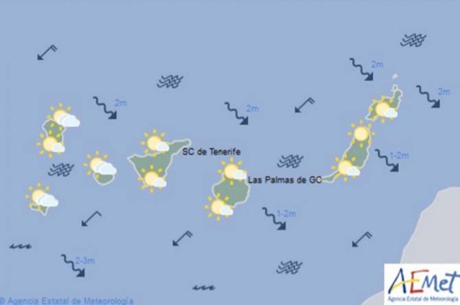 En el resto de vertientes, poco nuboso con algunos intervalos al Oeste por la tarde; en zonas por encima de 1.000 a 1.100 metros, despejado. En el Nordeste no se descarta alguna lluvia débil, ocasional y aislada de madrugada, preferentemente en medianías.