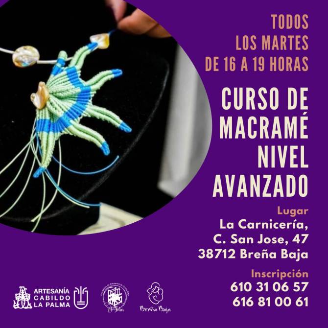 La Asociación de Artesanos "El Telar" de Breña Baja y la Concejalía de Artesanía del Ayuntamiento de Breña Baja organizan un Curso de Macramé Avanzado. Colabora y financia la Consejería de Artesanía del Cabildo Insular de La Palma.