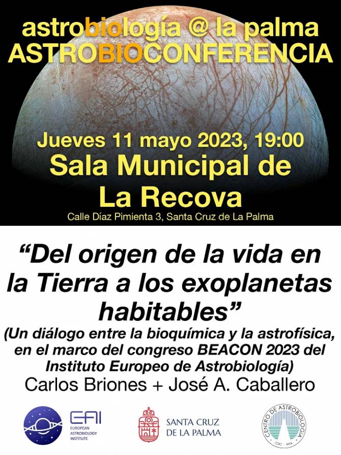 La cita, de carácter gratuito, tendrá lugar en la sala de arte de La Recova de la capital palmera a las 19:00 horas, donde el biólogo Carlos Briones y el astrofísico José Antonio Caballero, ambos del Centro de Astrobiología (CSIC-INTA), disertarán sobre 'Del origen de la vida en la Tierra a los exoplanetas habitables'.