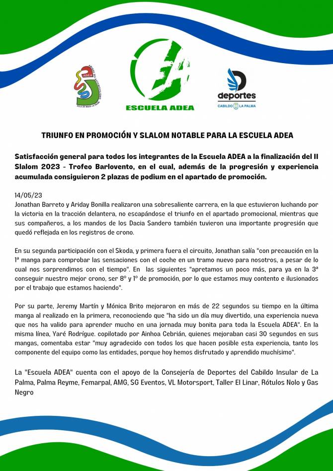 La "Escuela ADEA" cuenta con el apoyo de la Consejería de Deportes del Cabildo Insular de La Palma, Palma Reyme, Femarpal, AMG, SG Eventos, VL Motorsport, Taller El Linar, Rótulos Nolo y Gas Negro