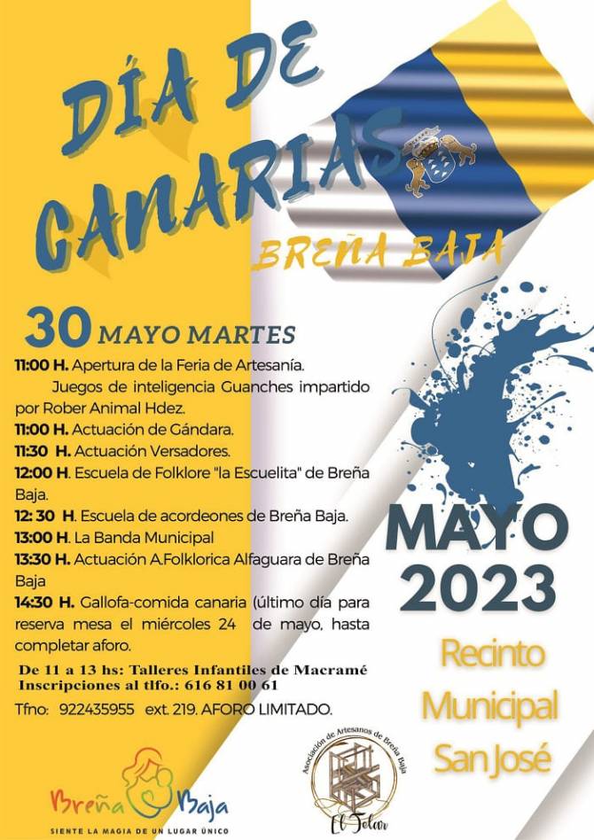 - 14.30 hs: Gallofa (comida canaria). Último día para reservar mesa hasta el miércoles 24 de mayo, hasta completar aforo, llamando al Ayuntamiento de Breña Baja al tlfo: 922 43 59 55 (Exts. 219).