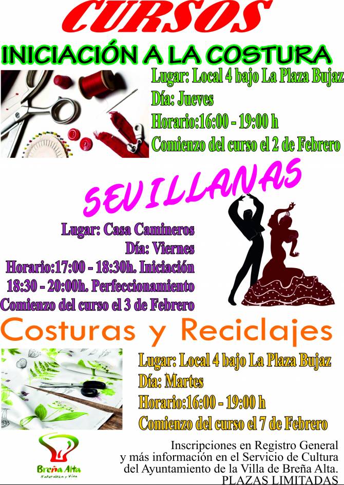 La actividad formativa Iniciación a la costura se imparte los jueves de cada semana, en horario de 16:00 a 19:00 horas, en el Local 4 de los bajos de la plaza Bujaz. El curso de Sevillanas tiene lugar los viernes en la Casa de Camineros. De 17:00 a 18:30 se celebran las clases de iniciación, mientras que de 18:30 a 20:00 horas se desarrollan las de perfeccionamiento. Por último, el curso de Costuras y reciclajes, que se inicia el 7 de febrero, tendrá lugar los martes, de 16:00 a 19:00 horas, en el Local 4 de los bajos de la plaza Bujaz.