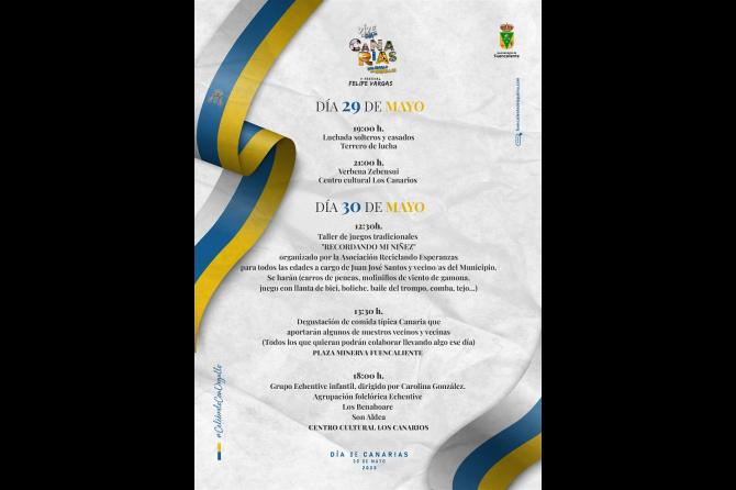 La celebración del Día de Canarias comenzará el lunes 29 de mayo, con una luchada entre solteros y casados, en el Terrero Municipal a partir de las 19:00 horas, concluyendo la jornada con una verbena con Zabensui Melián en el Centro Cultural de Los Canarios, a partir de las 21:00 horas.