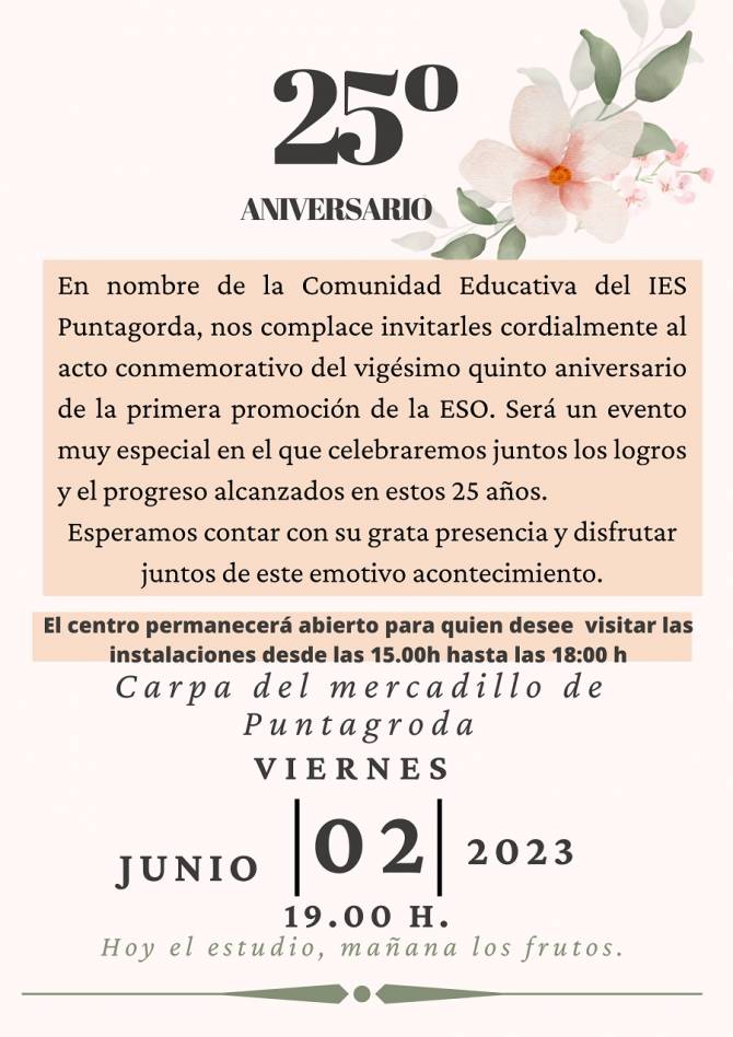 El IES Puntagorda celebra el vigésimoquinto aniversario de su primera promoción de la ESO. Por ello, se llevará a cabo un acto conmemorativo, el próximo día 02 de junio, a partir de las 19.00 horas, que tendrá lugar en la carpa del mercadillo de Puntagorda