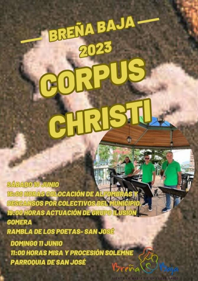 A las 11.00 horas se celebra la Santa Misa en honor al Cuerpo del Señor en la Iglesia Nueva de San José, cantada por el Coro Parroquial de San José y posteriormente se realiza la Solemne Procesión, acompañada por la Banda Municipal de Música de Breña Baja dirigida por Pablo Arrocha Morales.