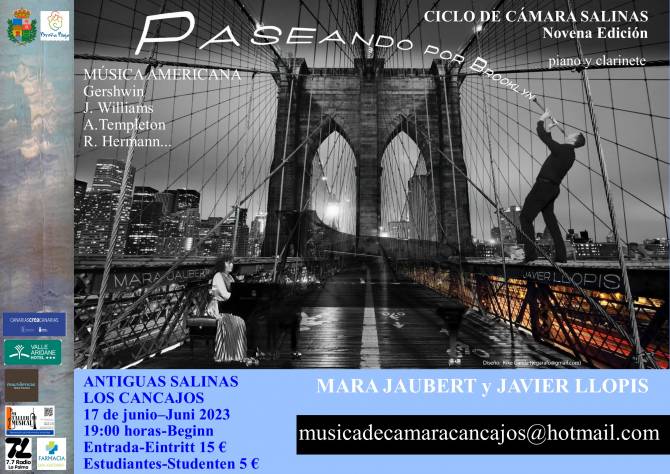 El sábado 17 de junio a las 19 hs, en las Antiguas Salinas de Los Cancajos tendrá lugar el décimo concierto del Ciclo de Cámara Salinas en su novena edición, con un concierto de piano y clarinete, Mara Jaubert y Javier Llopis, bajo el titulo “Paseando por Brooklyn”.