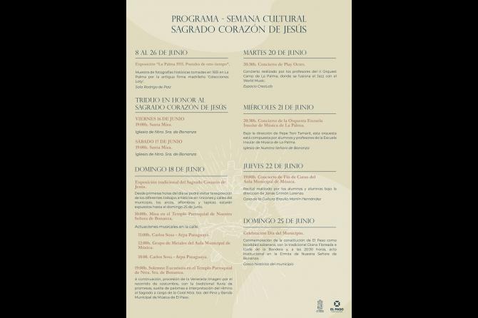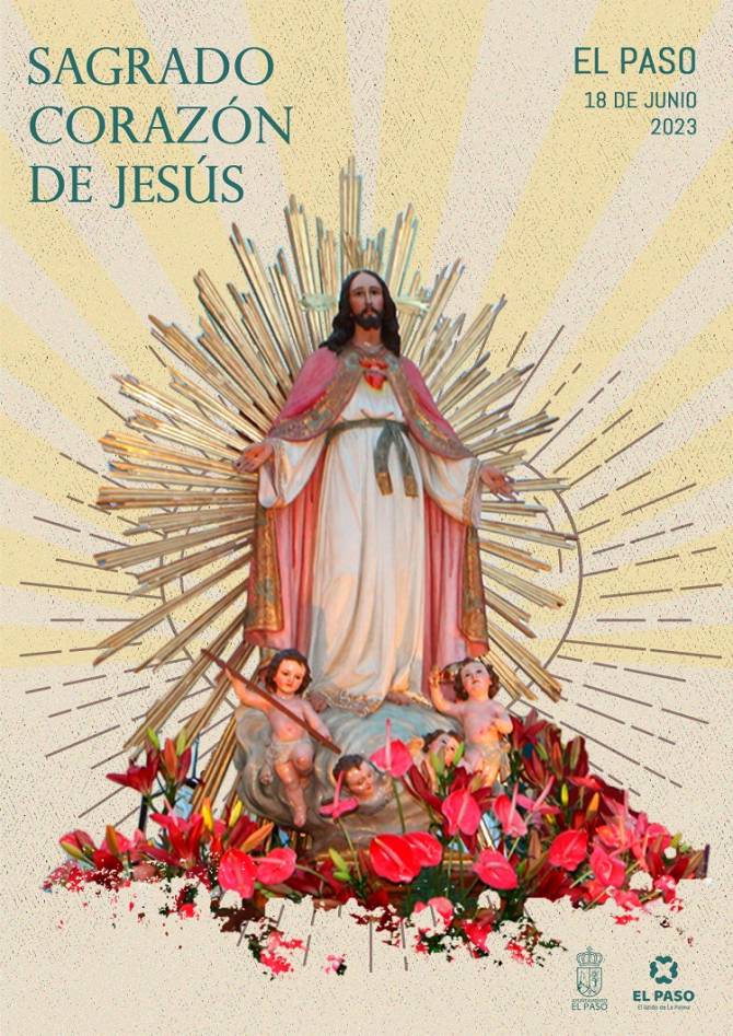 Posteriormente, a las 19:00 horas tendrá lugar la Solemne Eucaristía y Procesión en honor al Sagrado Corazón por el recorrido de costumbre, con la tradicional lluvia de promesas, la suelta de palomas y la interpretación del Himno al Sagrado a cargo de la Coral Ntra. Sra. Del Pino y Banda Municipal de Música de El Paso.