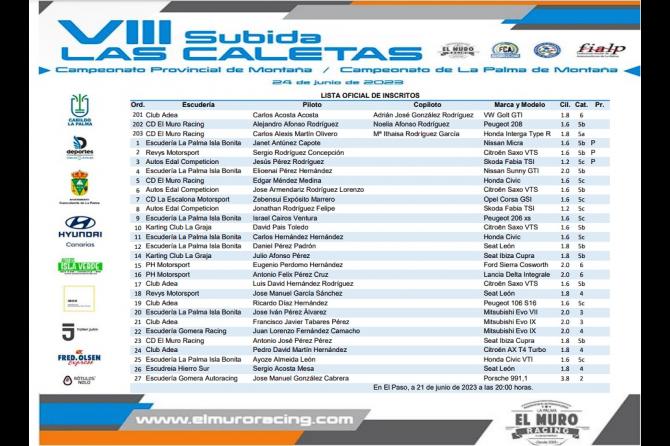 Hoy miércoles, y siguiendo lo que marca el programa horario, El Muro Racing publica la lista oficial de inscritos de la VIII Subida Las Caletas, prueba que se recupera después de cuatro años como parte de la hoja de ruta del campeonato provincial de montaña y del certamen insular de la especialidad. La prueba se pondrá en marcha este sábado 24 de junio, desde las 13:45 h, con 29 equipos inscritos.