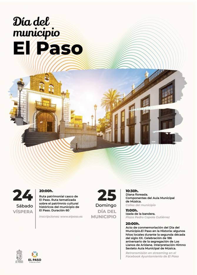 En horario de tarde, a las 20:00 horas, desde la Iglesia de Bonanza, lugar donde se celebró el primer pleno de la historia de la ciudad, se llevará a cabo el acto de conmemoración del Dia del Municipio de El Paso, con la presencia del pleno municipal y donde se rememorarán algunos hitos locales de la segunda década del siglo XX. Este acto podrá seguirse en directo a través de la página oficial de Facebook del propio Ayuntamiento.