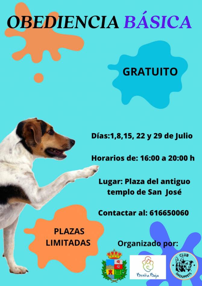 Todos los sábados del mes de julio en el Recinto Municipal de San José tendrá lugar un Curso sobre “Obediencia Básica” canina por parte del Club Snouppets y el Ayuntamiento de Breña Baja. Se lleva a cabo en los horario de 16 a 20 hs.