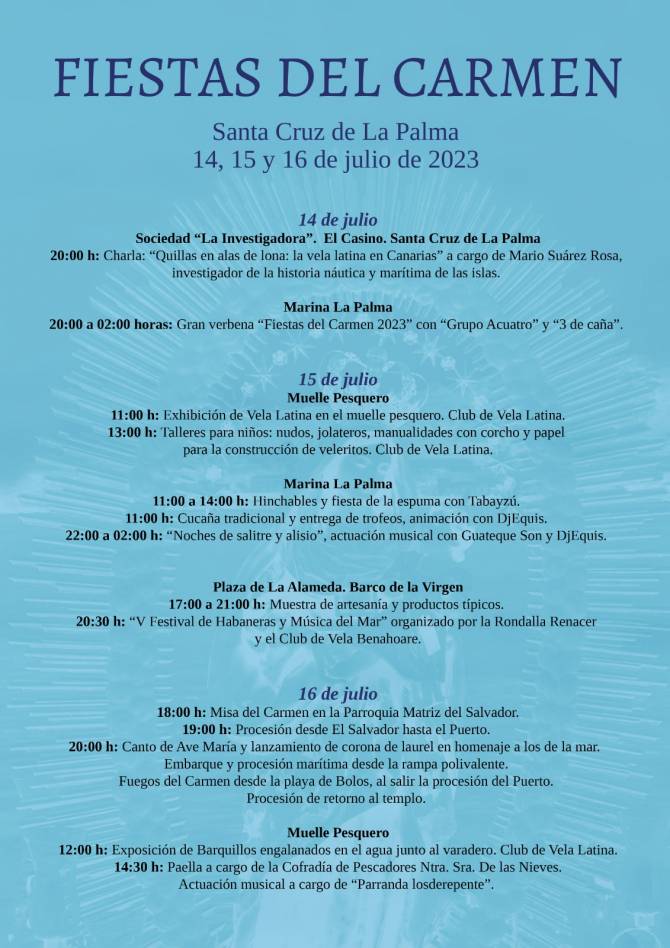 Desde el viernes 14 se ofrecerá una conferencia sobre vela latina en la sede de la Sociedad La Investigadora, a las 20:00 horas, sobre la cultura náutica y la historia de esta disciplina deportiva, como punto de partida a los festejos, para culminar la noche con la gran verbena 'Fiestas del Carmen, a partir de las 22:00 horas en La Marina, con las orquestas Grupo Acuatro y 3 de caña.