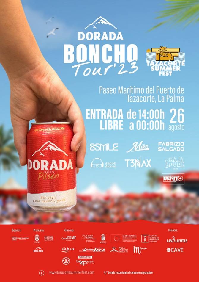 El próximo sábado 26 de agosto es la fecha elegida para celebrar la primera edición del Tazacorte Summer Fest tras su aplazamiento por el pasado incendio que afectó a parte de la comarca noroeste de la isla. Un evento diferente que llegará de la mano del conocido “Boncho Tour” promovido por la empresa canaria Cerveza DORADA conjugando perfectamente gastronomía, música y el buen clima que reina en la localidad bagañeta y poniendo también el foco en la sostenibilidad y en la ayuda a los afectados tras la erupción volcánica.