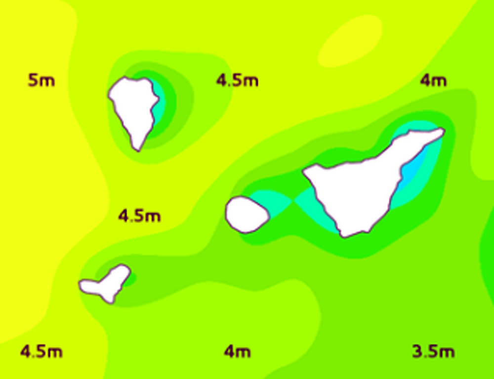 El mar estará del Oeste o Noroeste con fuerza 4 o 5, rolando y arreciando al Suroeste con fuerza 6 o 7, ocasionalmente 8 a partir de la madrugada.