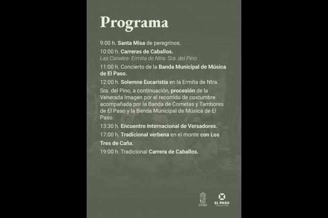 12:00h Solemne Eucaristía en la Ermita de Ntra. Sra. del Pino, a continuación, procesión de la Venerada Imagen por el recorrido de costumbre acompañada por la Banda de Cornetas y Tambores de El Paso y la Banda Municipal de Música de El Paso.