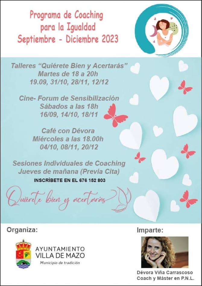 Los días 31 de octubre, 28 de noviembre y 12 de diciembre, en horario de 18:00 a 20:00 horas tendrán lugar los talleres 'Quiérete bien y acertarás'. El 14 de octubre y 18 de noviembre, a las 18:00 horas, se realizará un cine fórum de sensibilización. Los días 4 de octubre, 8 de noviembre y 20 de diciembre, a las 18:00 horas, tendrá lugar el encuentro 'Café con Dévora'. Por último, todos los jueves hasta el mes de diciembre las personas interesadas podrán tener sesiones individuales de coaching mediante cita previa.