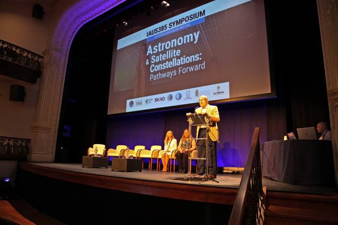 El Teatro Circo de Marte, en Santa Cruz de La Palma, ha acogido hoy a primera hora la inauguración del congreso de la Unión Astronómica Internacional (IAU) "IAUS385 Symposium: Astronomy and Satellite Constellations"(Astronomía y constelaciones de satélites: caminos a seguir) organizado por el Instituto de Astrofísica de Canarias (IAC) con la colaboración del Cabildo Insular de La Palma, el Ayuntamiento de Santa Cruz de La Palma