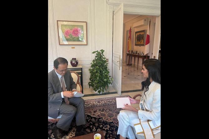 Claudia González, Miss International Spain 2023, lleva la seda de las Hilanderas de El Paso a la Embajada de Japón en España
