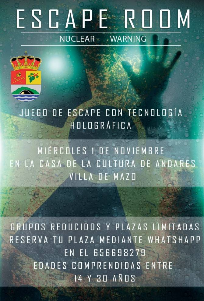 El Ayuntamiento de Villa de Mazo pone en marcha la celebración del 'Escape Room Nuclear Warning', un juego que tiene como objetivo escapar de un determinado espacio a través de pistas y mediante la cooperación en equipo. El evento tendrá lugar el miércoles, 1 de noviembre, en la Casa de la Cultura de Andares.