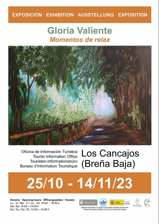 La Oficina de Turismo de Los Cancajos del 25 de octubre al 14 de noviembre acoge la exposición de pintura “Momentos de Relax” de Gloria Valiente en los horarios habituales de la oficina. Con la colaboración del Ayuntamiento de Breña Baja y el CIT Tedote, entre otras entidades.
