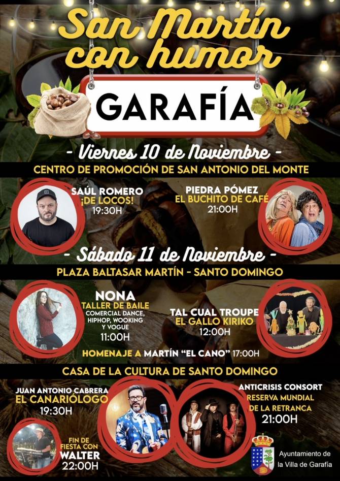 El Ayuntamiento de la Villa de Garafía a través de la concejala de Cultura, Daina del Arco Iris Sgobino Gallizio, ha confirmado que el próximo viernes 10 y sábado 11 de noviembre el municipio acogerá la celebración de "San Martín con Humor".